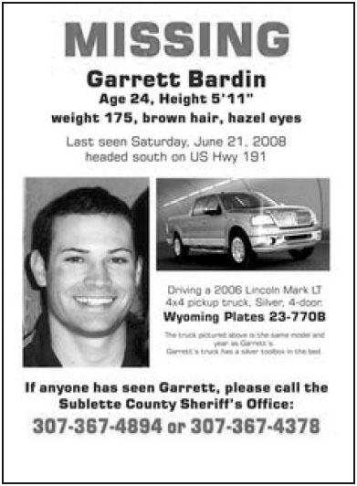 by Jennie Oemig After many days of searching, 24-year old Garrett Bardin is still missing. He was last seen on Saturday, June 21, headed south on US Hwy 191 in his 2006 Lincoln Mark LT 4x4 pickup. Detective Dick Blust, who is serving as the public information officer for the Sublette County Sheriff’s Office for the duration of the Rainbow Gathering, issued an updated media release on Wednesday. The pickup Bardin was driving was recovered on June 24 in a remote location about two miles from the old Dutch Joe Guard Station, near where the Rainbow Gathering is being held, with significant body damage including three bullet holes. “The three shots were fired into the vehicle in what appears a random pattern," Sublette County Undersheriff Jim Whinnery said in a July 2 press release. "It’s the sort of gunfire damage we often see in vandalism cases.” The truck was reportedly taken to a county facility where a forensic examination was conducted. With Sublette County Sheriff’s Office personnel, as well as Sublette County Tip Top Search and Rescue and family members, scouring the area on horseback and with dogs, the search has turned up no results. On June 26, a fund was set up at 1st Bank in Pinedale to help with funding for the search and rescue teams looking for Bardin. Because the vehicle was found near the site of the Rainbow Gathering, there has been much speculation that Bardin is inside the camp, though Whinnery could not confirm or deny those assumptions. "Unfortunately, we cannot, as of today, absolutely confirm that through direct contact with Garrett, as much as we’d like to,” he said. “ … No law enforcement agency has the authority to carry out a sweep search of the camp, and even if we did, it would be the equivalent of doing a detailed house-to house search of every home and business in Pinedale.” On Wednesday, rescue personnel from Tip Top Search and Rescue carried out another tight-scale grid search on both sides of the Big Sandy River. Today, searchers will be focusing on Muddy Ridge, which is also in the vicinity of where his vehicle was found. In the release issued Wednesday, Garrett’s father, Sublette County Sheriff Wayne “Bardy” Bardin expressed his gratitude for the efforts of the residents of Sublette County in trying to find Garrett. "Everyone has been so supportive and helpful, it’s hard to decide who to thank first," he said. "People who have been out searching, putting out flyers ... many have even offered to raise money for a reward. It’s times like this where you find out how many friends and neighbors you really have." Bardin is 5 feet 11 inches tall, weighs approximately 175 pounds and has short brown hair and hazel eyes. If anyone has any information about his whereabouts, they are asked to call the Sublette County Sheriff’s Office at (307) 367-4894 or (307) 367-4378. See The Archives for past articles. Copyright © 2008 Pinedale Roundup All rights reserved. Reproduction by any means must have permission of the Publisher. Pinedale Roundup, PO Box 100, Pinedale, WY 82941 Phone 307-367-2123 editor@pinedaleroundup.com |