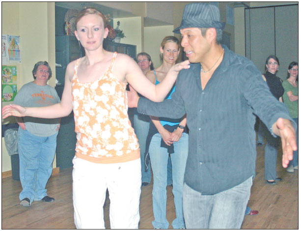 by Mari Muzzi Professional instructor Manny Sanchez demonstrates a salsa dance to the class with Brittany Noganosh. More than 40 local residents attended the workshop at Rendezvous Pointe last week. Photo credits: Mari Muzzi See The Archives for past articles. Copyright © 2009 Pinedale Roundup All rights reserved. Reproduction by any means must have permission of the Publisher. Pinedale Roundup, PO Box 100, Pinedale, WY 82941 Phone 307-367-2123 editor@pinedaleroundup.com |