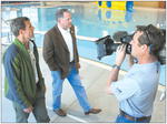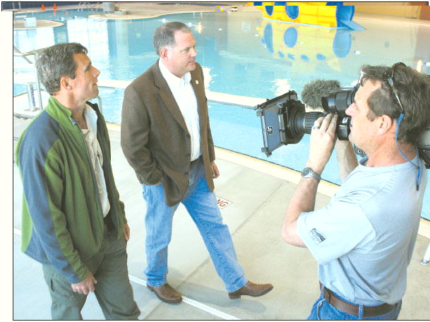 by Stephen Crane A camera crew from ABC News was in Sublette County on Monday and Tuesday to film a segment for World News with Charles Gibson, which will highlight the fact that Sublette County enjoys the lowest unemployment rate in the nation. The two-minute segment is scheduled to air sometime in the ‘next week or so,’ according to producer Alyssa Litoff. Here, Mayor Stephen Smith and ABC News correspondent Terry McCarthy discuss the economics of the area while poolside at the Pinedale Aquatic Center. Photo credits: Stephen Crane See The Archives for past articles. Copyright © 2009 Pinedale Roundup All rights reserved. Reproduction by any means must have permission of the Publisher. Pinedale Roundup, PO Box 100, Pinedale, WY 82941 Phone 307-367-2123 editor@pinedaleroundup.com |